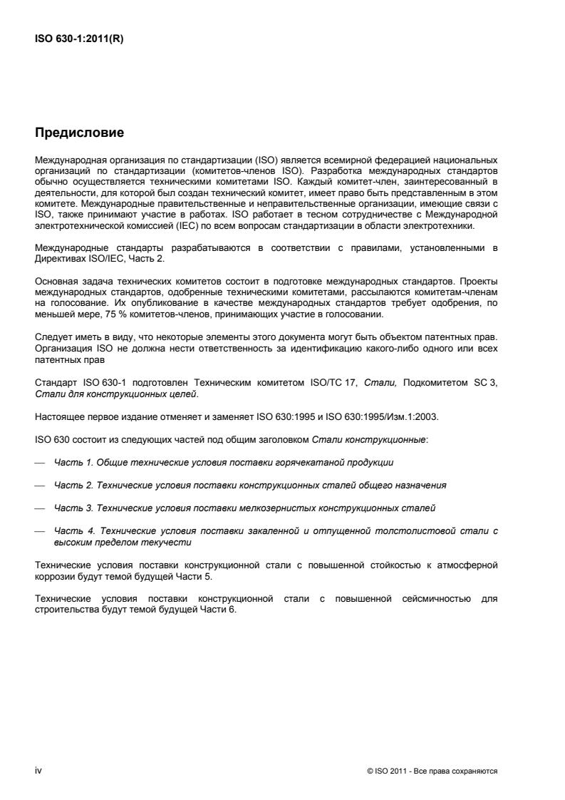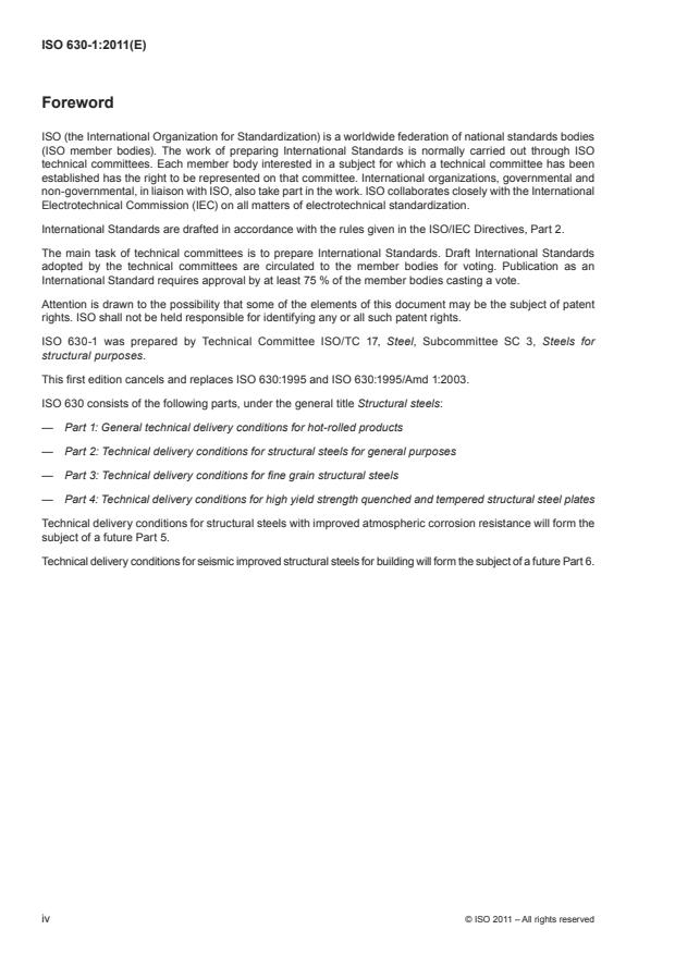 ISO 630-1:2011 specifies the general technical delivery conditions for steel flat and long products (plate/sections/wide flats and bars) used principally for general-purpose structural steels. The steels specified in ISO 630-1:2011 are intended for use in welded or bolted structures. The specific requirements for structural steels are given in the individual parts of ISO 630.