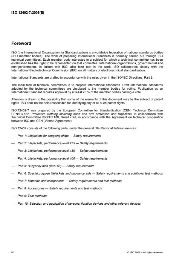 ISO 12402-7:2006 is a standard published by the International Organization for Standardization (ISO). Its full title is "Personal flotation devices — Part 7: Materials and components — Safety requirements and test methods". This standard covers: ISO 12402-7:2006 specifies the minimum requirements for construction and performance of materials and components of personal flotation devices as well as relevant test methods.