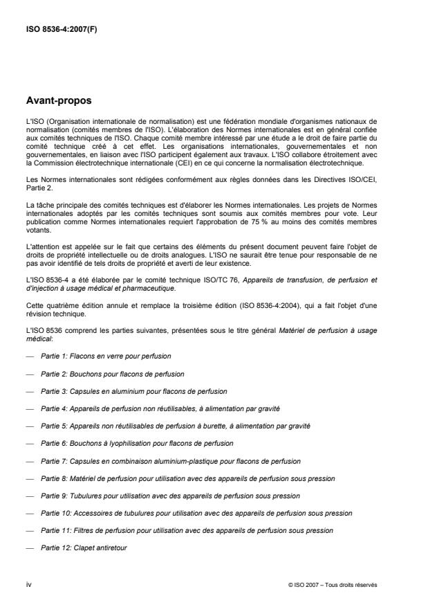 L'ISO 8536-4:2007 spécifie les exigences applicables aux appareils de perfusion à usage médical, non réutilisables, à alimentation par gravité, afin d'assurer leur compatibilité avec les récipients contenant des solutions de perfusion et avec les appareils intraveineux. Le deuxième objectif de l'ISO 8536-4:2007 est de donner des directives sur les spécifications relatives à la qualité et aux performances des matériaux utilisés dans les appareils de perfusion et de proposer une terminologie concernant les composants de ces derniers. Dans certains pays, la pharmacopée nationale ou d'autres règlements nationaux ont force d'obligation et ont priorité sur l'ISO 8536-4:2007.