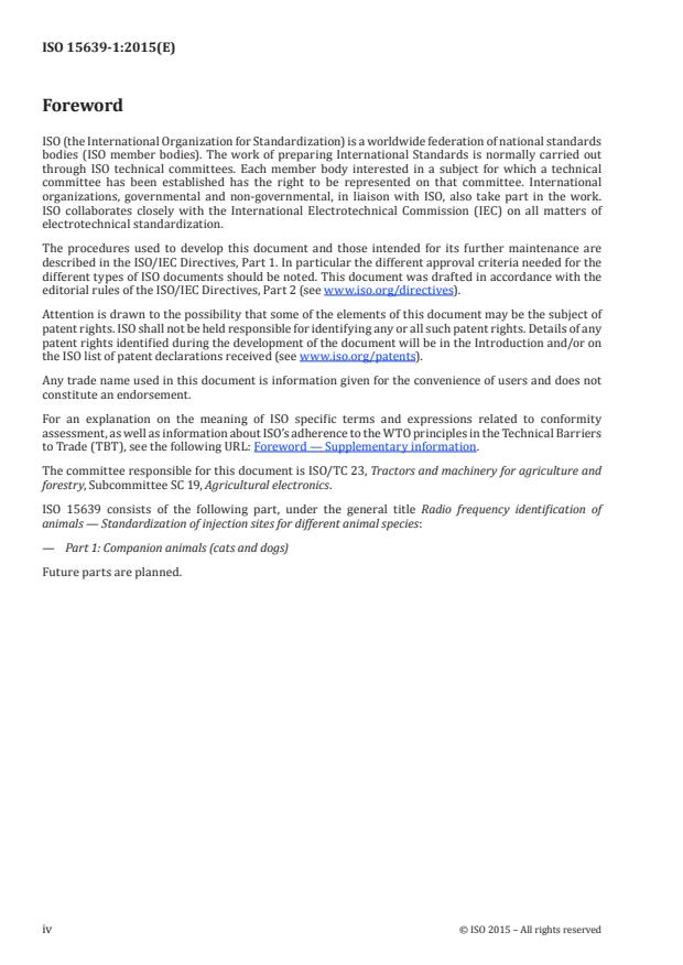 ISO 15639-1:2015 is a standard published by the International Organization for Standardization (ISO). Its full title is "Radio frequency identification of animals - Standardization of injection sites for different animal species - Part 1: Companion animals (cats and dogs)". This standard covers: ISO 15639-1:2015 of the injection sites of animal species is related to different species and several fields of interest. After decades of market experience, migration of the transponder is still a problem in most animal species being identified by injectable transponders. Migration is related to several factors. The major issues are the injection site and the application of the injectable transponder but the correct injection site can be dictated by the dimensions (length and diameter) of the injectable transponder. In dogs and cats, this is not a big issue as the transponders used are the smallest readily available. There are several publications which precisely describe the application of injectable transponders anatomically but there is a demand from the community to have a comprehensive overview of all aspects related to the application and use of injectable transponders for different animal species.