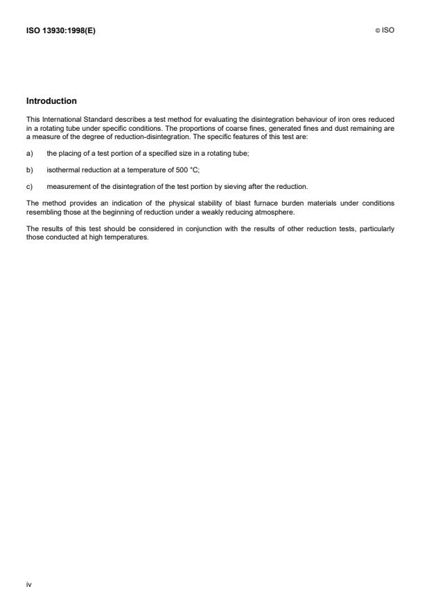 This International Standard describes a test method for evaluating the disintegration behaviour of iron ores reduced