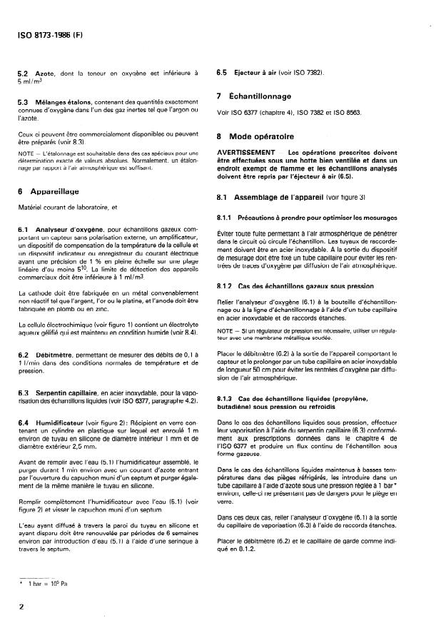 ISO 8173:1986 is a standard published by the International Organization for Standardization (ISO). Its full title is "Light olefins for industrial use — Determination of molecular oxygen in gaseous phase — Electrochemical method with a membrane- covered cell". This standard covers: After sampling and preparation of the laboratory sample the gaseous test portion is passed at a given rate through an electrochemical cell previously calibrated with air or with standard mixtures containing a known amount of oxygen, and the concentration of oxygen in the gaseous olefin is measured. The method is applicable to light olefins having an oxygen content greater than 1 milliliter per cubicmeter.