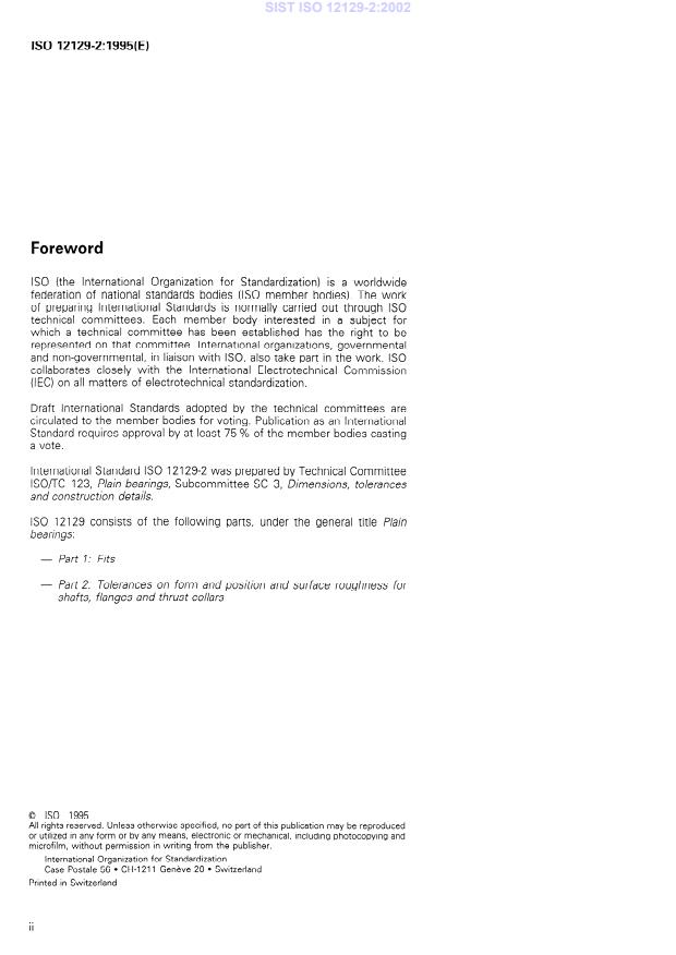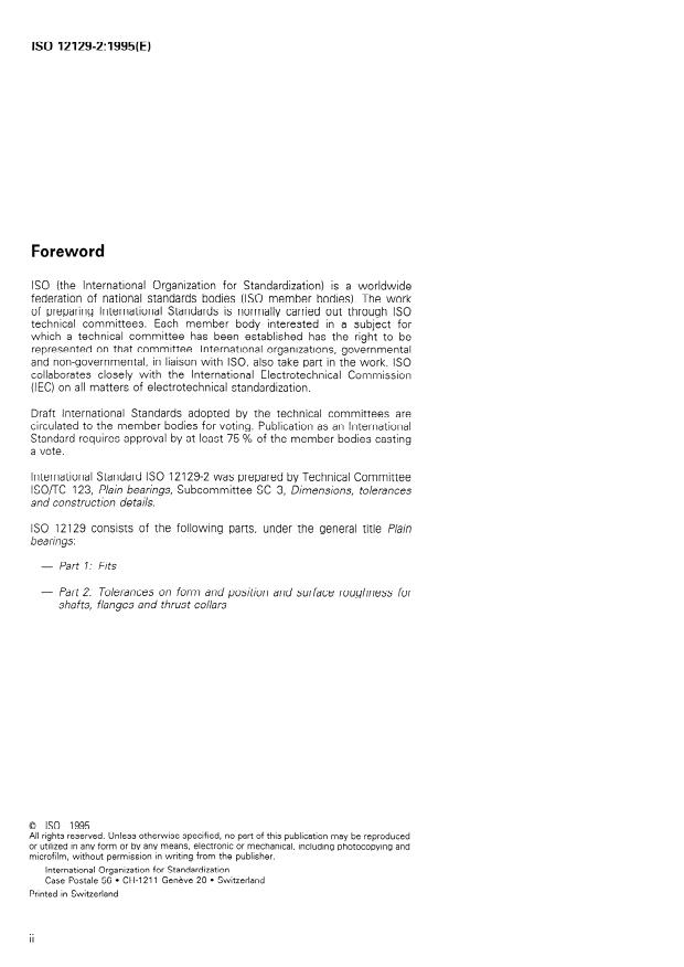 INTERNATIONAL STANDARD ISO 12129-2 First edition 1995-04-01 Plain bearings - Part 2: Tolerantes on form and Position and surface roughness for shafts, flanges and thrust collars Pahers lisses - Partie 2: Tokrances de forme et de position et rugosite de surface des arbres, collerettes et collets de butee Reference number ISO 12129-2:1995(E) SIST ISO 12129-2:2002