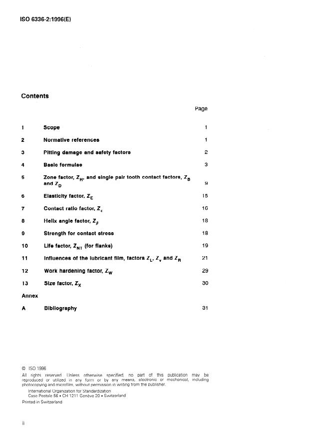 ISO 6336-2:1996 is a standard published by the International Organization for Standardization (ISO). Its full title is "Calculation of load capacity of spur and helical gears — Part 2: Calculation of surface durability (pitting)". This standard covers: Gives the fundamental formulae for use in the determination of the load capacity of cylindrical gears with involute internal or external teeth.