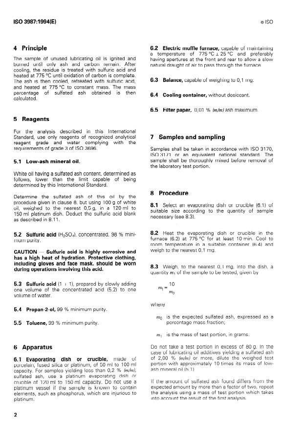 ISO 3987:1994 is a standard published by the International Organization for Standardization (ISO). Its full title is "Petroleum products — Lubricating oils and additives — Determination of sulfated ash". This standard covers: Cancels and replaces the first edition (1980). Describes a procedure for the determination of the mass percentage of sulfated ash from unused lubricating oils containing additives and from additive concentrates used in compounding. These additives usually contain one or more of the following metals: barium, calcium, magnesium, zinc, potassium, sodium and tin. Not intended for the analysis of used engine oils containing lead, nor is it recommended for the analysis of non-additive lubricating oils.