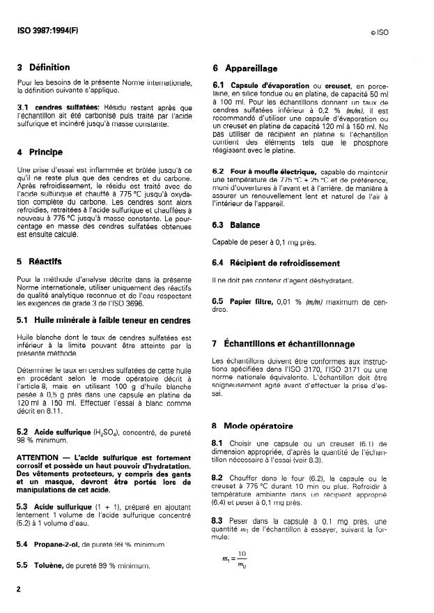 ISO 3987:1994 - Produits pétroliers -- Huiles lubrifiantes et additifs -- Détermination des cendres sulfatées