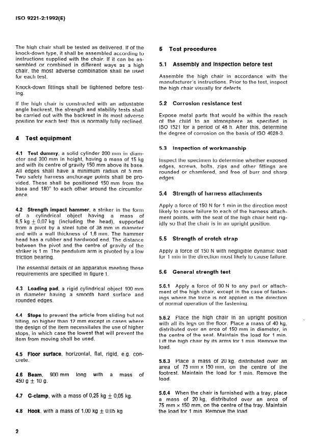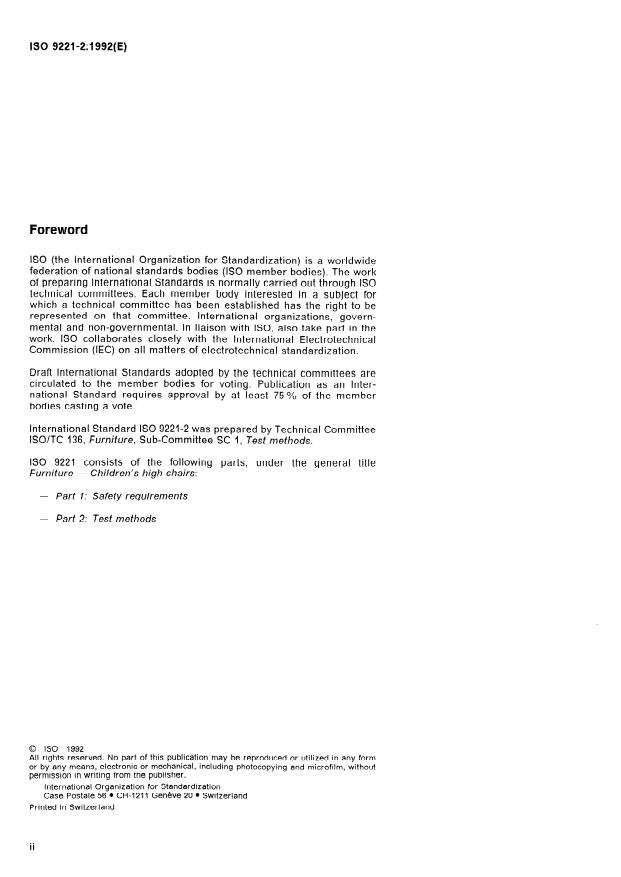 ISO 9221-2:1992 is a standard published by the International Organization for Standardization (ISO). Its full title is "Furniture — Children's high chairs — Part 2: Test methods". This standard covers: Specifies test methods that assess the safety requirements given in ISO 9221-1 of children's high chairs and multi-purpose chairs for domestic use. The tests consist of the application, to various parts of the item, of forces simulating normal functional use, as well as misuse, that can reasonably be expected to occur. The tests are designed to evaluate properties without regard to materials, design/construction or manufacturing processes.
