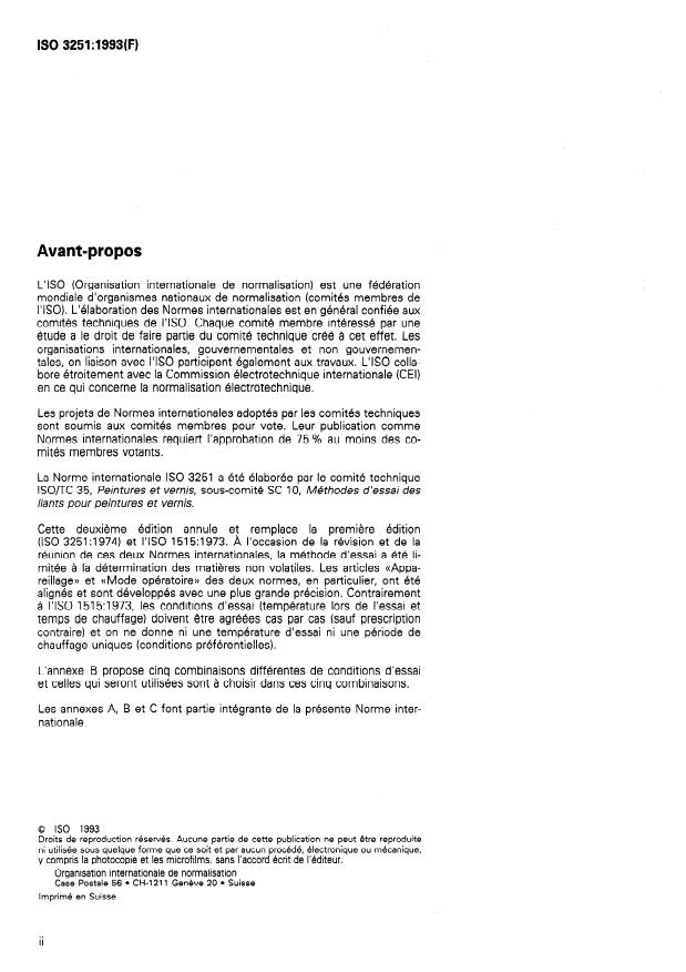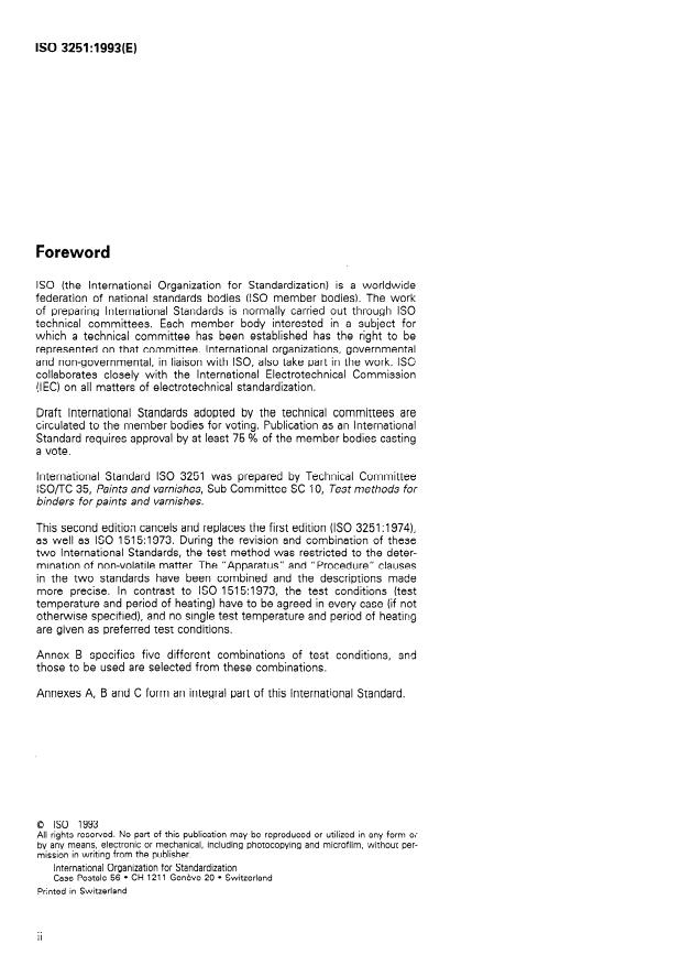 ISO 3251:1993 is a standard published by the International Organization for Standardization (ISO). Its full title is "Paints and varnishes — Determination of non-volatile matter of paints, varnishes and binders for paints and varnishes". This standard covers: Specifies a test method for determining the non-volatile matter content by mass of paints and varnishes, as well as resins and resin solutions that are intended for use as binders for paints and varnishes. Annex A gives required supplementary information, annex B describes the test conditions.