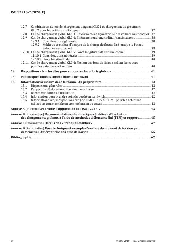 Ce document définit les dimensions, les pressions de conception locales et les charges globales agissant sur les bateaux multicoques d'une longueur de coque (LH) ou une longueur de référence jusqu'à 24 m (voir la Note). Il prend en compte toutes les parties du bateau qui sont considérées étanches à l'eau ou aux intempéries lors de l'évaluation de la stabilité, du franc-bord et de la flottabilité conformément à l'ISO 12217 (toutes les parties). Les échantillonnages correspondant aux pressions nominales locales sont ensuite évalués à l'aide de l'ISO 12215-5. NOTE La longueur de référence est définie dans la «Convention internationale sur les lignes de charge 1966/2005» de l'OMI, elle peut être plus petite que LH pour des bateaux ayant des élancements. Cette longueur établit également à 24 m, la limite inférieure de plusieurs Conventions Internationales de l'OMI. Ce document est applicable aux multicoques construits à partir des mêmes matériaux que dans l'ISO 12215-5 à l'état intact et des deux types suivants: — les bateaux de plaisance, y compris les bateaux de location avec skipper («charter»); — les bateaux à usage commercial et les bateaux de travail. Il ne s'applique pas aux multicoques de course conçus uniquement pour les courses avec équipage professionnel. Ce document est applicable aux structures supportant des fenêtres, hublots, panneaux, tapes et portes. Pour un échantillonnage complet du bateau, le présent document est destiné à être utilisé conjointement avec l'ISO 12215-8 pour les gouvernails, l'ISO 12215-9 pour les appendices des voiliers et l'ISO 12215-10 pour les charges dans le gréement et les points d'ancrage du gréement. L'ISO 12215-6 peut être utilisée pour des détails supplémentaires. Dans tout le présent document et sauf spécification contraire, les dimensions sont en (m), les surfaces en (m2), les forces en (N), les moments en (Nm), les pressions en kN/m2 (1kN/m2 = 1 kPa), les contraintes et modules d'élasticité en N/mm2 (1N/mm2 = 1 Mpa).
