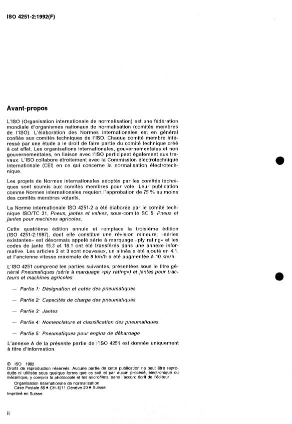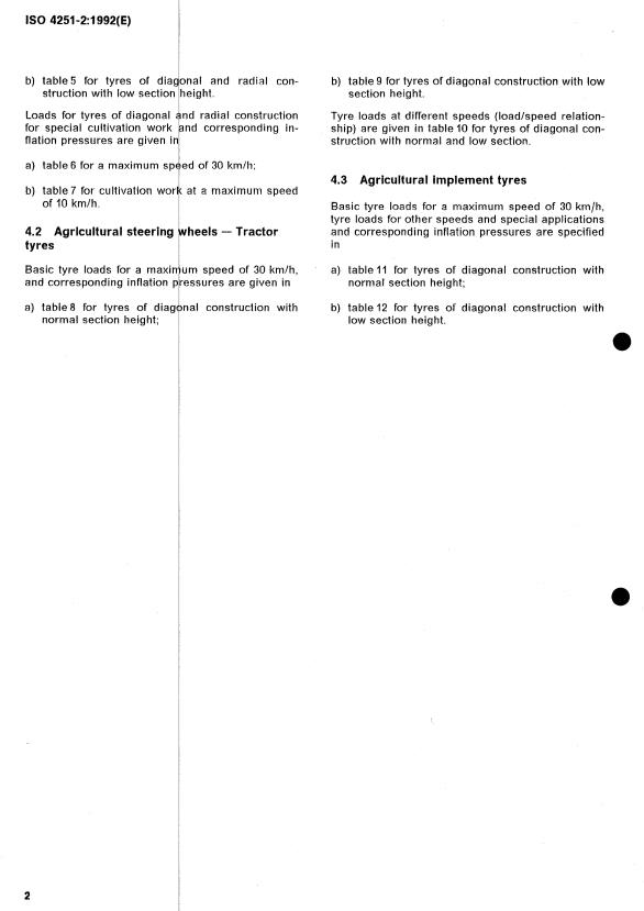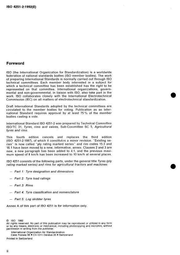 ISO 4251-2:1992 is a standard published by the International Organization for Standardization (ISO). Its full title is "Tyres (ply rating marked series) and rims for agricultural tractors and machines — Part 2: Tyre load ratings". This standard covers: Tyres (ply rating marked series) and rims for agricultural tractors and machines — Part 2: Tyre load ratings