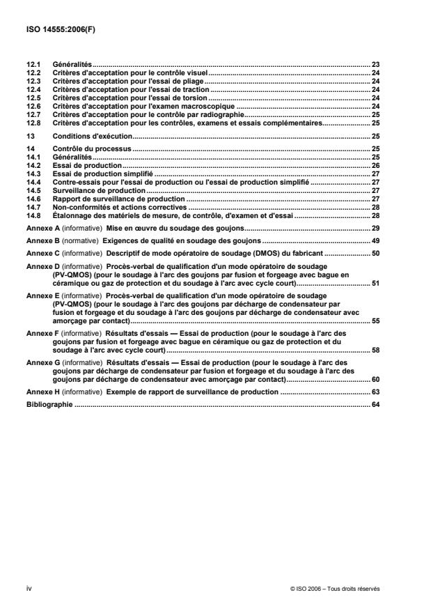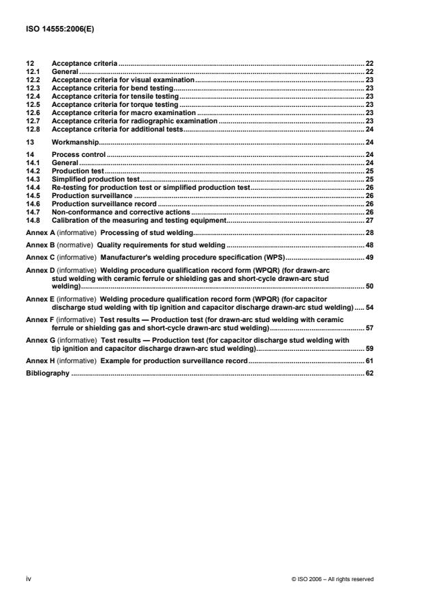 ISO 14555:2006 covers arc stud welding of metallic materials subject to static and dynamic loading. It specifies requirements that are particular to stud welding, in relation to welding knowledge, quality requirements, welding procedure specification, welding procedure qualification, qualification testing of operators and testing of production welds. ISO 14555:2006 is appropriate where it is necessary to demonstrate the capability of a manufacturer to produce welded construction of a specified quality. ISO 14555:2006 has been prepared in a comprehensive manner, with a view to its being used as a reference in contracts. The requirements contained within it can be adopted in full, or partially, if certain requirements are not relevant to a particular construction.
