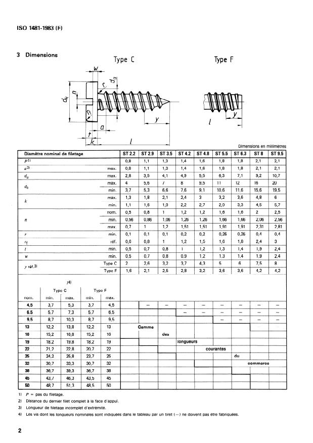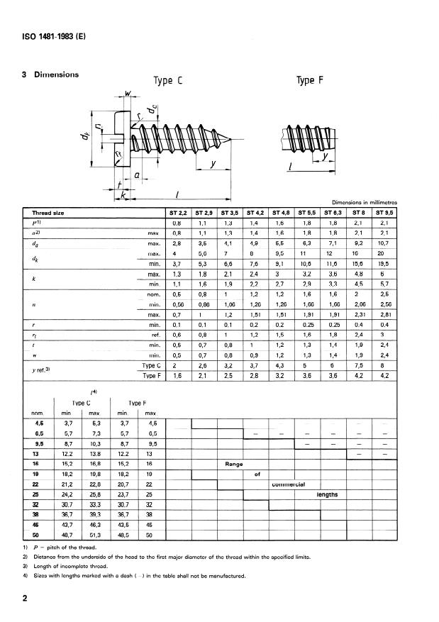 ISO 1481:1983 is a standard published by the International Organization for Standardization (ISO). Its full title is "Slotted pan head tapping screws". This standard covers: Specifies the characteristics of screws with thread sizes from ST 2,2 up to and including ST 9,5; includes specifications with reference to International Standards; gives an example for the designation.