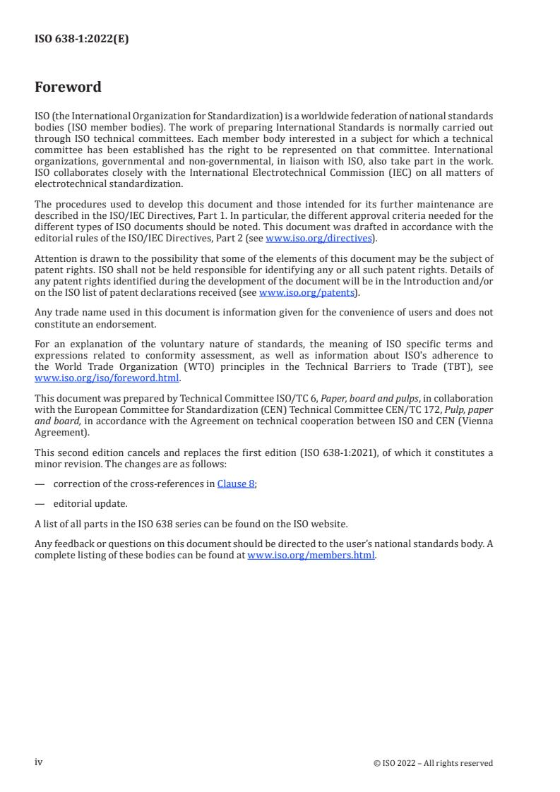ISO 638-1:2022 is a standard published by the International Organization for Standardization (ISO). Its full title is "Paper, board, pulps and cellulosic nanomaterials - Determination of dry matter content by oven-drying method - Part 1: Materials in solid form". This standard covers: This document specifies an oven-drying method for the determination of the dry matter content in paper, board, pulp and cellulosic nanomaterials in solid form, which all can be produced from virgin and /or recycled materials. It is also applicable to the determination of the dry matter content of paper and board for recycling. The procedure is applicable to paper, board, and pulp and cellulosic nanomaterials which do not contain any appreciable quantities of materials other than water that are volatile at the temperature of 105 °C ± 2 °C. It is used, for example, in the case of pulp, paper, and board and cellulosic nanomaterial samples taken for chemical and physical tests in the laboratory, when a concurrent determination of dry matter content is required. This method is not applicable to the determination of the dry matter content of slush pulp or to the determination of the saleable mass of pulp lots. NOTE 1 ISO 638-2[1] specifies an oven-drying method for the determination of the dry matter content of suspensions of cellulosic nanomaterials, ISO 287[2] specifies the determination of the moisture content of a lot of paper and board; ISO 4119[3] specifies the determination of stock concentration of pulps; the ISO 801 series[4] specifies the determination of the saleable mass in lots. NOTE 2 This document determines the total dry matter content of the sample, including any dissolved solids. If only the cellulosic material content free of dissolved solids is desired, dissolved solids are removed prior to measuring the dry matter content, e.g. by washing or dialysis, taking care to retain all cellulosic material; in cases where the sample is filterable without loss of cellulosic solids, ISO 4119[3] can be used to determine the stock consistency (content of cellulosic material in solid form).