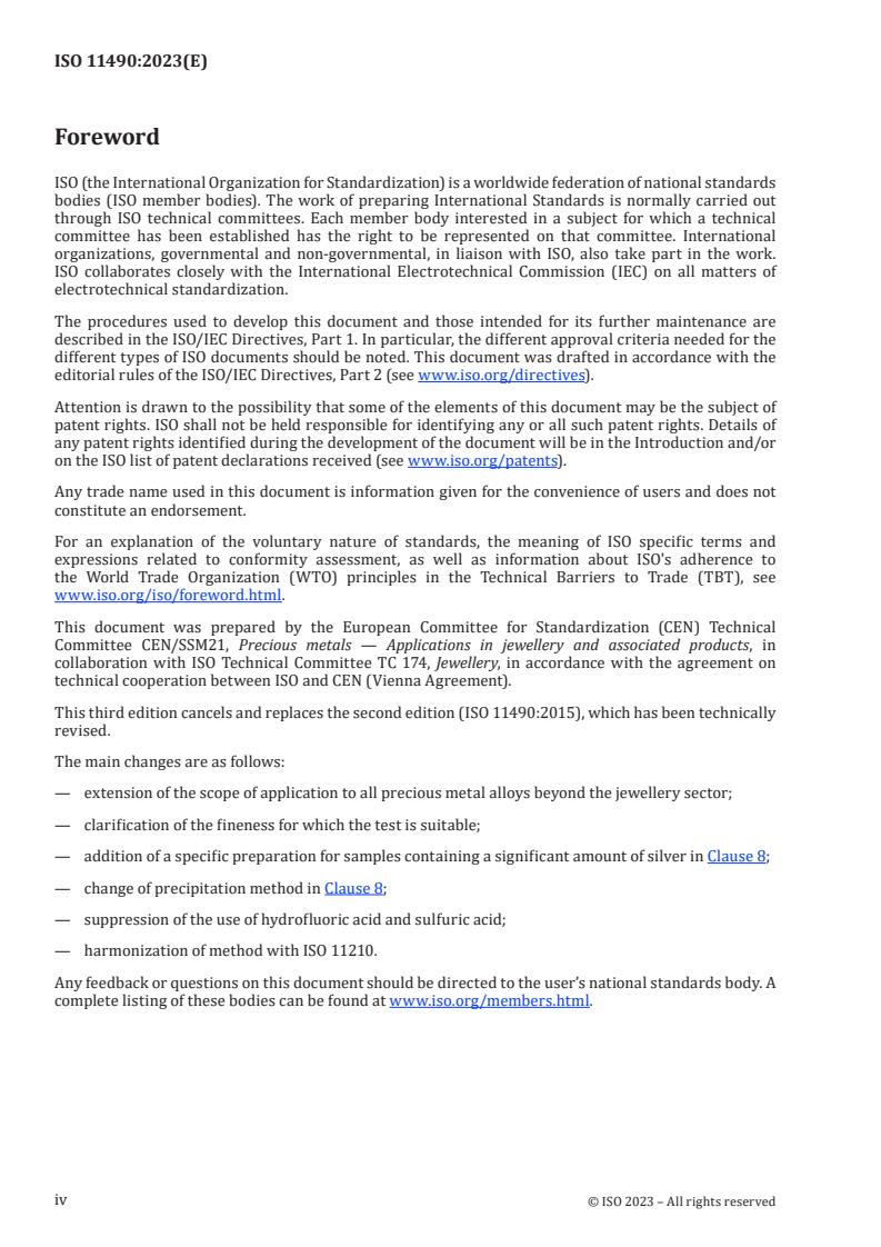 ISO 11490:2023 is a standard published by the International Organization for Standardization (ISO). Its full title is "Jewellery and precious metals - Determination of palladium - Gravimetry using dimethylglyoxime". This standard covers: This document specifies a gravimetric method for the determination of palladium on a material considered homogeneous. The palladium content of the sample lies preferably between 50 and 999 parts per thousand (‰) by mass. Fineness above 999 ‰ can be determined using a spectroscopy method by difference (e.g. ISO 15093). This method is also intended to be used as one of the recommended methods for the determination of fineness in jewellery alloys covered by ISO 9202.