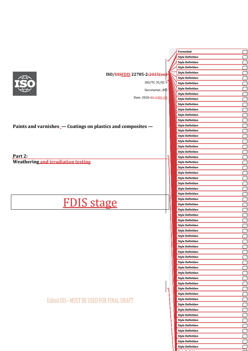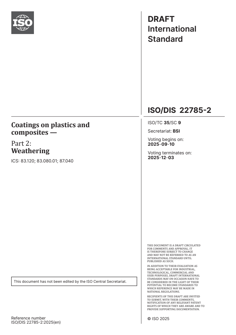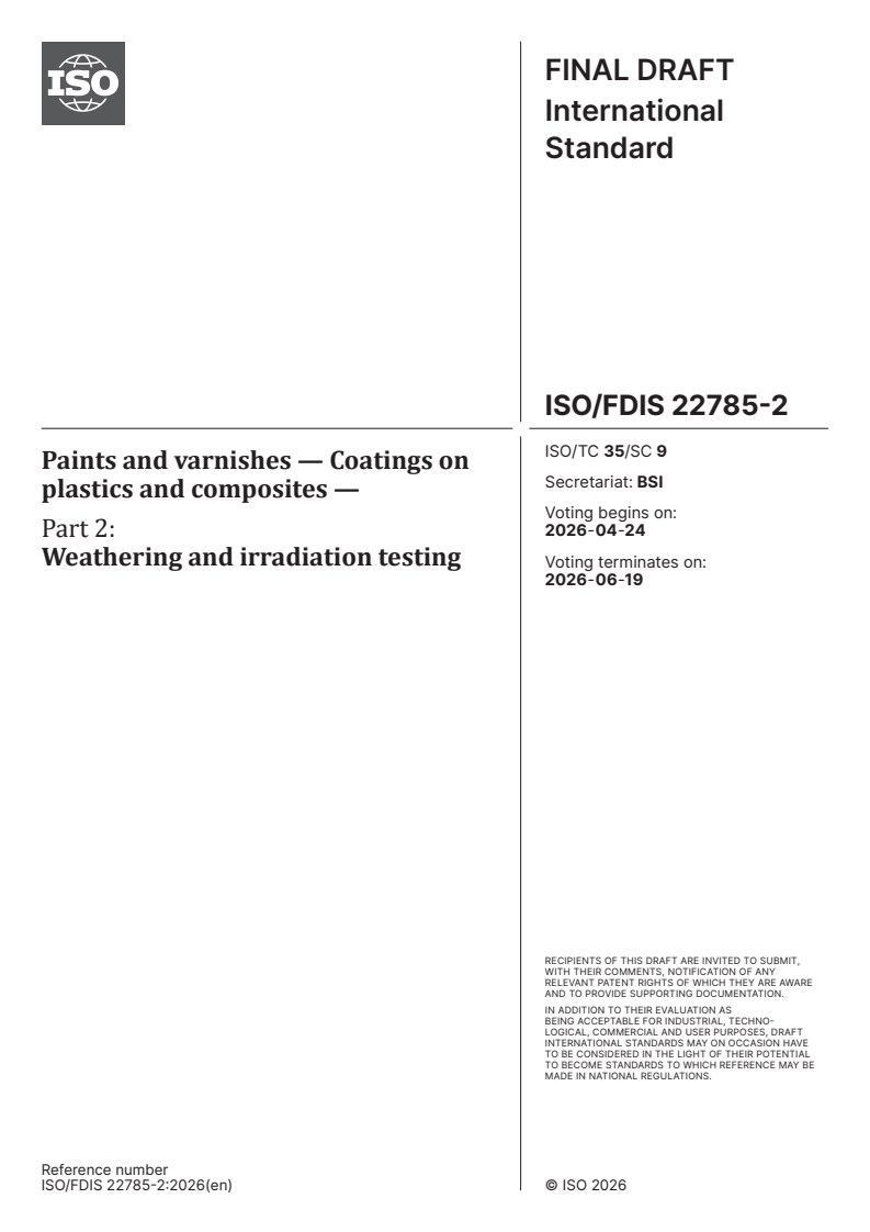 ISO/FDIS 22785-2 - Paints and varnishes — Coatings on plastics and composites — Part 2: Weathering/16/2025