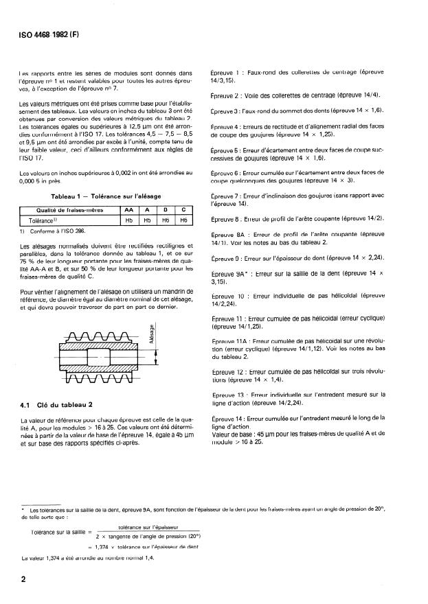 * Les tolcirances SW la saillie de la dent, kpreuve 9A, sont fonction de I’epaisseur de la dent pour les fraises-m&es ayant un angle de pression de 20°,