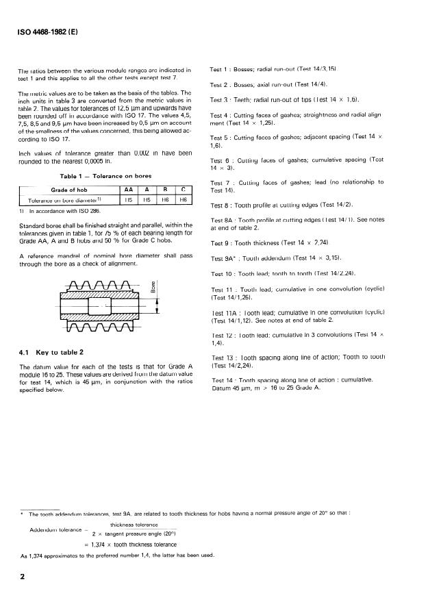 Applies to single start hobs of 1 to 40 module and 25 to 0,625 diametral pitch for helical and straight spur gears. It applies to solid and inserted blade hobs. Accuracy grades are AA, A, B and C where grade AA is the highest order of precision. Gives elemental tests for hobs and permitted tolerances for the practical test consisting of the measurement of the position of the cutting edges along a line of action which requires special equipment.