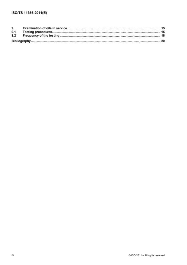 ISO/TS 11366:2011 is a technical specification published by the International Organization for Standardization (ISO). Its full title is "Petroleum and related products - Guidance for in-servicing of lubricating oils for steam, gas and combined-cycle turbines". This standard covers: ISO/TS 11366:2011 applies to mineral oils used as lubricating oils and to control fluids used to lubricate steam, gas and combined cycle turbines in service. The lubricants considered in ISO/TS 11366:2011 are those classified in ISO 6743-5 and specified in ISO 8068. ISO/TS 11366:2011 is intended to help power equipment operators evaluate the conditions of the oil in their equipment and maintain the oils in serviceable conditions; help users understand how the oils deteriorate and carry out a meaningful programme of sampling and testing of oils in use. ISO/TS 11366:2011 also gives instructions with respect to the corrective actions that are taken to maximize service life.