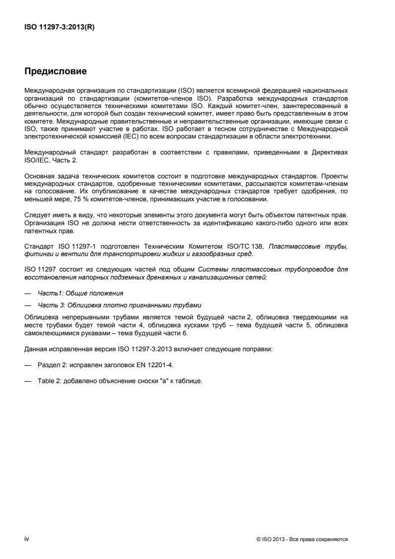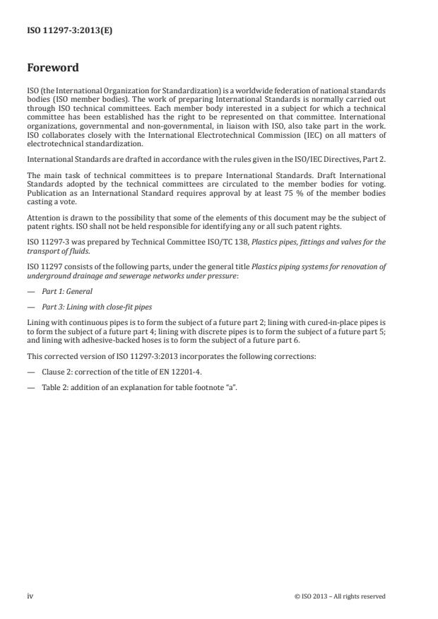 ISO 11297-3:2013 is a standard published by the International Organization for Standardization (ISO). Its full title is "Plastics piping systems for renovation of underground drainage and sewerage networks under pressure — Part 3: Lining with close-fit pipes". This standard covers: ISO 11297-3:2013, in conjunction with ISO 11297-1, specifies requirements and test methods for close-fit lining systems intended to be used for the renovation of underground drainage and sewerage networks under pressure. It is applicable to pipes and fittings, as manufactured, as well as to the installed lining system. It is applicable to polyethylene (PE) pipe for both independent and interactive pressure pipe liners as well as associated fittings and joints for the construction of the lining system.