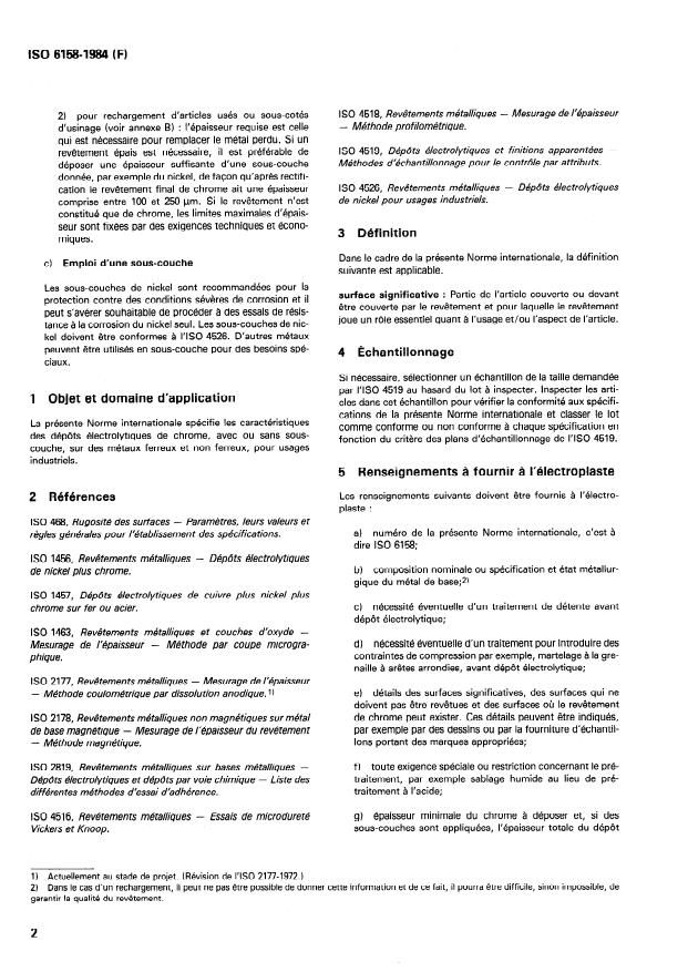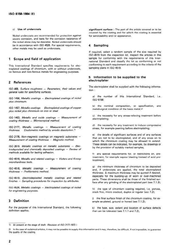 ISO 6158:1984 is a standard published by the International Organization for Standardization (ISO). Its full title is "Metallic coatings — Electroplated coatings of chromium for engineering purposes". This standard covers: Specifies requirements for these coatings, with or without undercoats, on ferrous and non-ferrous metals. Defines the term "significant surface" and gives sampling, information to be supplied to the electroplater, treatment of basis meatal, coating requirements. heat treatment, test methods and peening conditions (annex A) and reclamation of worn chromium electroplated articles (annex B) respectively.