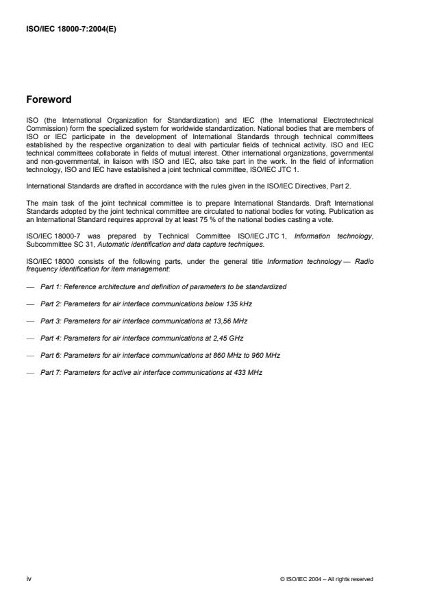 ISO/IEC 18000-7:2004 defines the air interface for radio-frequency identification (RFID) devices operating as an active RF Tag in the 433 MHz band used in item management applications. Its purpose is to provide a common technical specification for RFID devices that may be used by ISO committees developing RFID application standards. This standard is intended to allow for compatibility and to encourage inter-operability of products for the growing RFID market in the international marketplace. ISO/IEC 18000-7:2004 defines the forward and return link parameters for technical attributes including, but not limited to, operating frequency, operating channel accuracy, occupied channel bandwidth, maximum power, spurious emissions, modulation, duty cycle, data coding, bit rate, bit rate accuracy, bit transmission order, and where appropriate operating channels, frequency hop rate, hop sequence, spreading sequence, and chip rate. ISO/IEC 18000-7:2004 further defines the communications protocol used in the air interface.