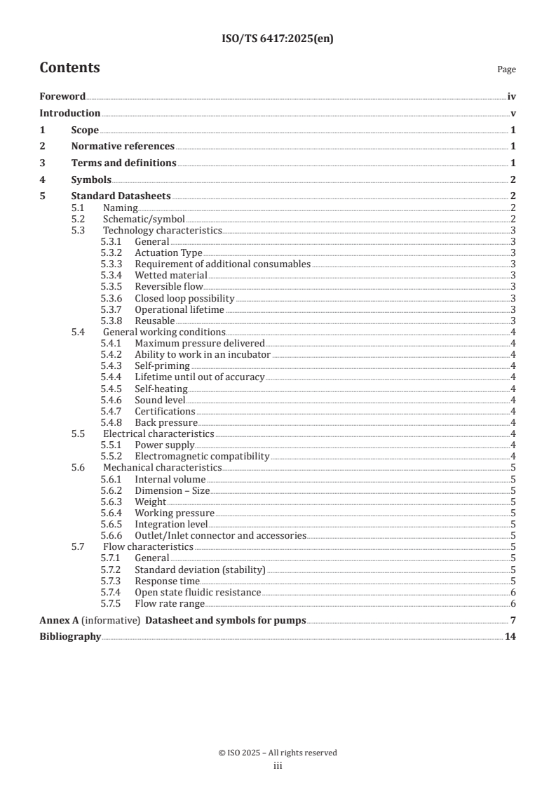 ISO/TS 6417:2025 is a technical specification published by the International Organization for Standardization (ISO). Its full title is "Microfluidic pumps - Symbols and performance communication". This standard covers: This document provides symbols and defines standard datasheets for some of the most often used microfluidic pumps, such as the peristaltic pump, pressure pump, syringe pump and diaphragm/membrane pump.
