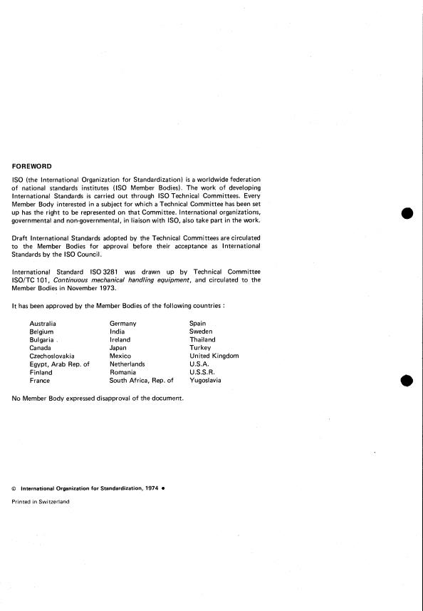 ISO 3281:1974 is classified under the following ICS (International Classification for Standards) categories: 53.040.01 - Continuous handling equipment in general. The ICS classification helps identify the subject area and facilitates finding related standards.