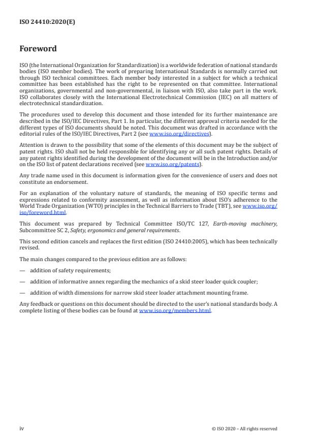 ISO 24410:2020 is a standard published by the International Organization for Standardization (ISO). Its full title is "Earth-moving machinery — Coupling of attachments to skid steer loaders". This standard covers: This document provides for the interchangeability of attachments on skid steer loaders by establishing requirements for the quick coupler system including dimensional limits for the attachment mounting frame. These quick couplers are typically used on skid steer loaders as defined in ISO 6165. NOTE 1 Skid steer loaders can use other styles of quick couplers but the coupler would not be interchangeable with attachments designed to comply with this document. NOTE 2 The requirements of this document can be applied to quick couplers used on other compact machines. NOTE 3 Quick couplers used on small skid steer loaders and some compact tool carriers can have a different width requirement than provided in this document. See Annex B.