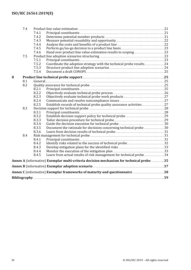 ISO/IEC 26561:2019 organizes the product line technical probe into management, operationalization and support functions. Key topics include: