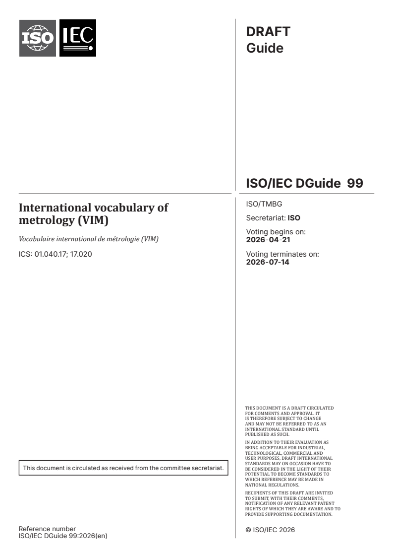 ISO/IEC DGuide 99 is a draft published by the International Organization for Standardization (ISO). Its full title is "International vocabulary of metrology (VIM)". This standard covers: International vocabulary of metrology (VIM)
