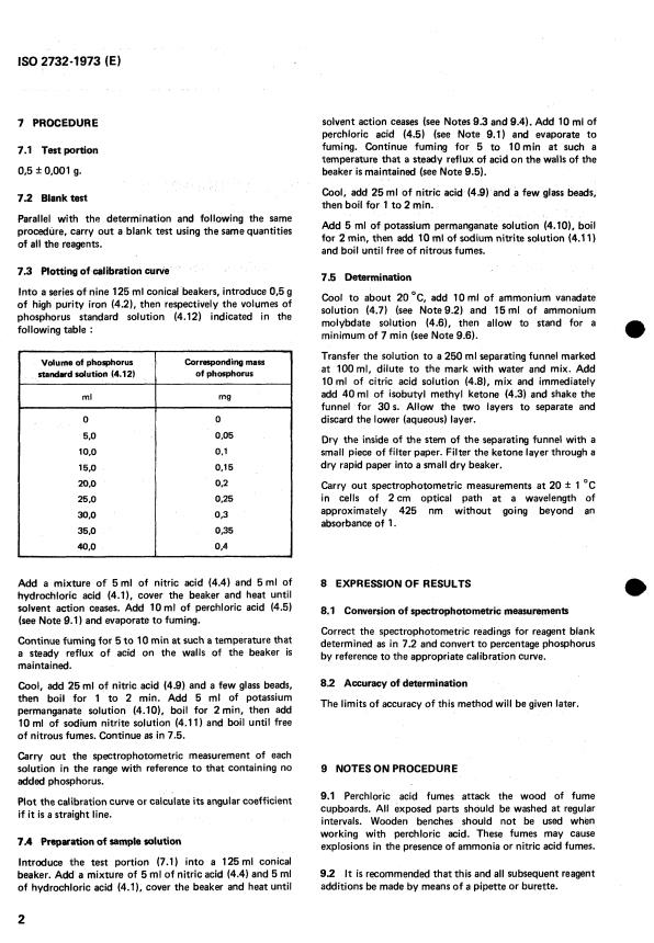 ISO 2732:1973 is a standard published by the International Organization for Standardization (ISO). Its full title is "Steels and cast iron — Determination of phosphorus — Spectrophotometric method". This standard covers: Steels and cast iron — Determination of phosphorus — Spectrophotometric method