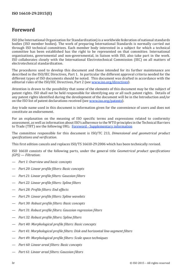 ISO 16610-29:2015 is a standard published by the International Organization for Standardization (ISO). Its full title is "Geometrical product specifications (GPS) — Filtration — Part 29: Linear profile filters: Spline wavelets". This standard covers: ISO 16610-29:2015 specifies spline wavelets for profiles and contains the relevant concepts. It gives the basic terminology for spline wavelets of compact support, together with their usage.