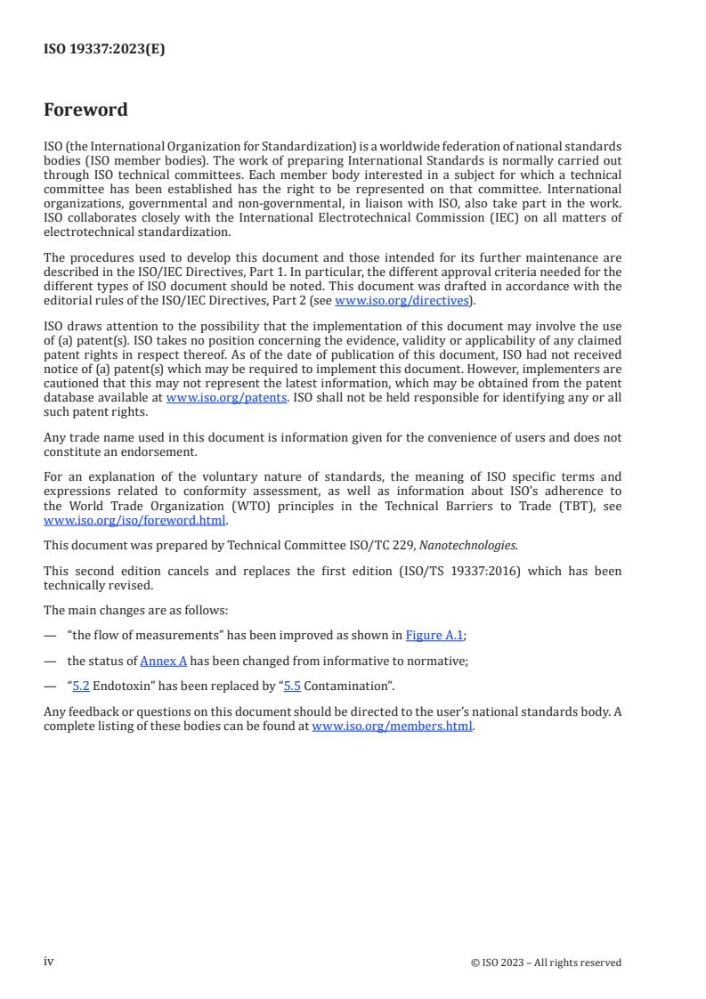 ISO 19337:2023 is a standard published by the International Organization for Standardization (ISO). Its full title is "Nanotechnologies - Characteristics of working suspensions of nano-objects for in vitro assays to evaluate inherent nano-object toxicity". This standard covers: This document describes the characteristics of working suspensions of nano-objects to be considered when conducting in vitro assays to evaluate inherent nano-object toxicity. In addition, the document identifies applicable measurement methods for these characteristics. This document is applicable to nano-objects, and their aggregates and agglomerates greater than 100 nm. This document intends to help clarify whether observed toxic effects come from tested nano-objects themselves or from uncontrolled sources.
