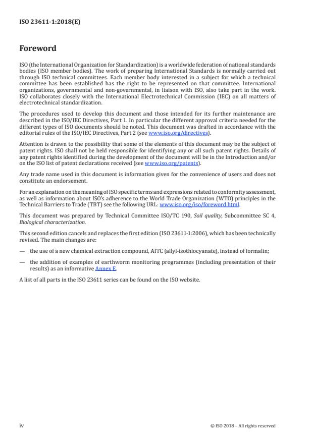 ISO 23611-1:2018 is a standard published by the International Organization for Standardization (ISO). Its full title is "Soil quality — Sampling of soil invertebrates — Part 1: Hand-sorting and extraction of earthworms". This standard covers: This document specifies a method for sampling and handling earthworms from field soils as a prerequisite for using these animals as bioindicators (e.g. to assess the quality of a soil as a habitat for organisms). This document applies to all terrestrial biotopes in which earthworms occur. The sampling design of field studies in general is given in ISO 18400‑101 and guidance on the determination of effects of pollutants on earthworms in field situations is given in ISO 11268‑3. These aspects can vary according to the national requirements or the climatic/regional conditions of the site to be sampled (see also Annex C). This document is not applicable for semi-terrestrial soils and it can be difficult to use under extreme climatic or geographical conditions (e.g. in high mountains). Methods for some other soil organism groups, such as collembolans, are covered in other parts of ISO 23611.
