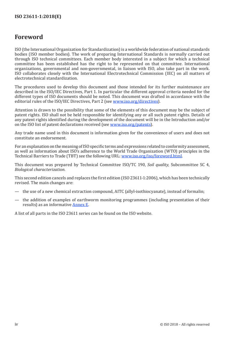ISO 23611-1:2018 is a standard published by the International Organization for Standardization (ISO). Its full title is "Soil quality - Sampling of soil invertebrates - Part 1: Hand-sorting and extraction of earthworms". This standard covers: This document specifies a method for sampling and handling earthworms from field soils as a prerequisite for using these animals as bioindicators (e.g. to assess the quality of a soil as a habitat for organisms). This document applies to all terrestrial biotopes in which earthworms occur. The sampling design of field studies in general is given in ISO 18400‑101 and guidance on the determination of effects of pollutants on earthworms in field situations is given in ISO 11268‑3. These aspects can vary according to the national requirements or the climatic/regional conditions of the site to be sampled (see also Annex C). This document is not applicable for semi-terrestrial soils and it can be difficult to use under extreme climatic or geographical conditions (e.g. in high mountains). Methods for some other soil organism groups, such as collembolans, are covered in other parts of ISO 23611.