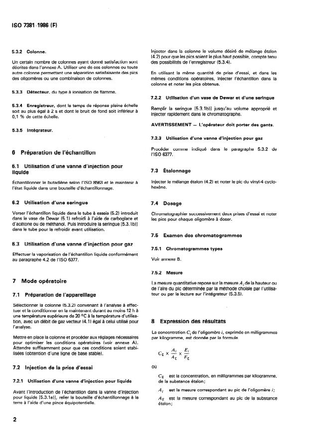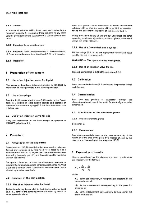 ISO 7381:1986 is a standard published by the International Organization for Standardization (ISO). Its full title is "Butadiene for industrial use — Determination of oligomers — Gas chromatographic method". This standard covers: A liquid or a vaporized gaseous test portion is injected into a gas chromatography column. After passage of the test portion through this column the oligomers are separated. The detection is performed by flame ionization. The peaks obtained are compared with those derived from an external standard. The oligomers which may be present are: 4-vinyl cyclohexene, 1,3-cyclooctadiene, 1,5-cyclooctadiene. The method is applicable to butadiene having oligomer contents greater than 10 mg/kg.