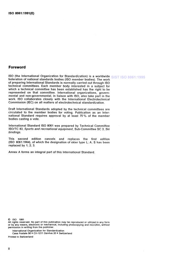 ISO 8061:1991 is a standard published by the International Organization for Standardization (ISO). Its full title is "Alpine ski-bindings — Selection of release torque values". This standard covers: Gives information necessary to determine the release torques. The methods apply to torque-measuring binding test machines. This second edition cancels and replaces the first edition (1984). Annex A is for information only.