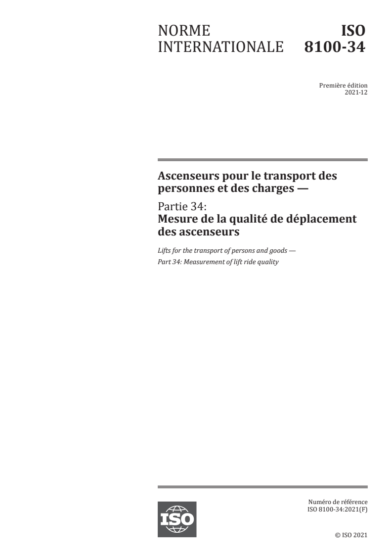 ISO 8100-34:2021 - Ascenseurs pour le transport des personnes et des charges — Partie 34: Mesure de la qualité de déplacement des ascenseurs Released:12/20/2021