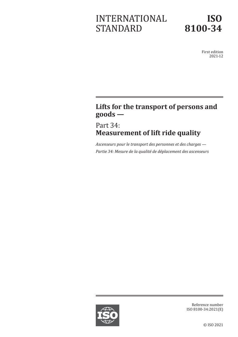 ISO 8100-34:2021 - Lifts for the transport of persons and goods — Part 34: Measurement of lift ride quality Released:12/20/2021