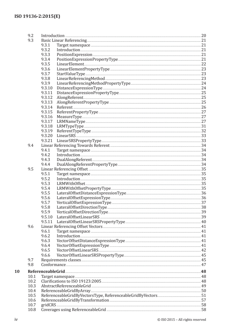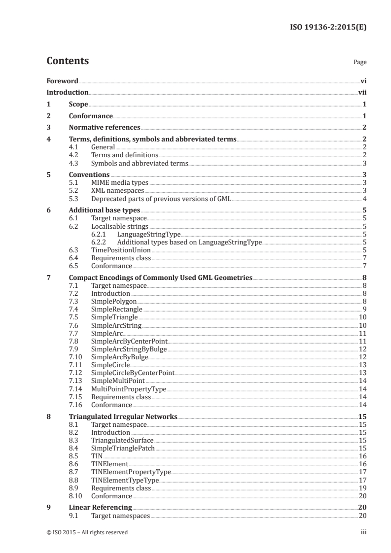 ISO 19136-2:2015 is a standard published by the International Organization for Standardization (ISO). Its full title is "Geographic information — Geography Markup Language (GML) — Part 2: Extended schemas and encoding rules". This standard covers: The Geography Markup Language (GML) is an XML encoding in compliance with ISO 19118 for the transport and storage of geographic information modelled in accordance with the conceptual modelling framework used in the ISO 19100‑ series of International Standards and including both the spatial and non-spatial properties of geographic features. ISO 19136-2:2015 defines the XML Schema syntax, mechanisms and conventions that: ? provide an open, vendor-neutral framework for the description of geospatial application schemas for the transport and storage of geographic information in XML; ? allow profiles that support proper subsets of GML framework descriptive capabilities; ? support the description of geospatial application schemas for specialized domains and information communities; ? enable the creation and maintenance of linked geographic application schemas and datasets; ? support the storage and transport of application schemas and datasets; ? increase the ability of organizations to share geographic application schemas and the information they describe. Implementers may decide to store geographic application schemas and information in GML, or they may decide to convert from some other storage format on demand and use GML only for schema and data transport. ISO 19136-2:2015 builds on ISO 19136:2007 (GML 3.2), and extends it with additional schema components and requirements. NOTE If an ISO 19109 conformant application schema described in UML is used as the basis for the storage and transportation of geographic information, this part of ISO 19136 provides normative rules for the mapping of such an application schema to a GML application schema in XML Schema and, as such, to an XML encoding for data with a logical structure in accordance with the ISO 19109 conformant application schema.