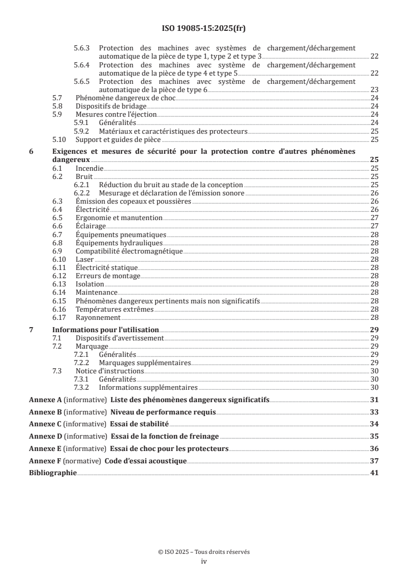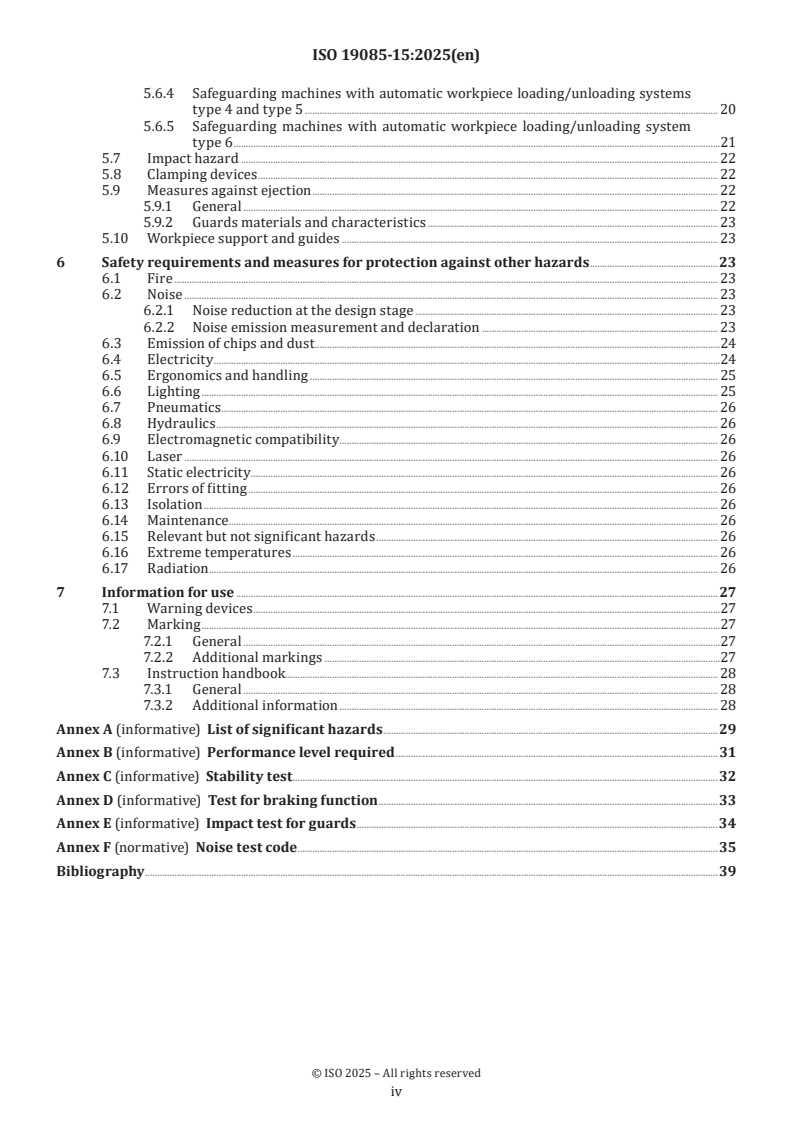 - Supporting annexes: Annexes cover the list of significant hazards, performance level guidance, tests for stability, braking and impact, plus a noise test code.