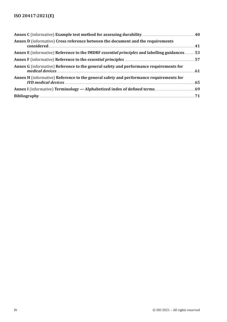 ISO 20417:2021 is a standard published by the International Organization for Standardization (ISO). Its full title is "Medical devices - Information to be supplied by the manufacturer". This standard covers: NOTE 1 There is guidance or rationale for this Clause contained in Clause A.2. This document specifies the requirements for information supplied by the manufacturer for a medical device or by the manufacturer for an accessory, as defined in 3.1. This document includes the generally applicable requirements for identification and labels on a medical device or accessory, the packaging, marking of a medical device or accessory, and accompanying information. This document does not specify the means by which the information is to be supplied. NOTE 2 Some authorities having jurisdiction impose different requirements for the identification, marking and documentation of a medical device or accessory. Specific requirements of medical device product standards or group standards take precedence over requirements of this document.