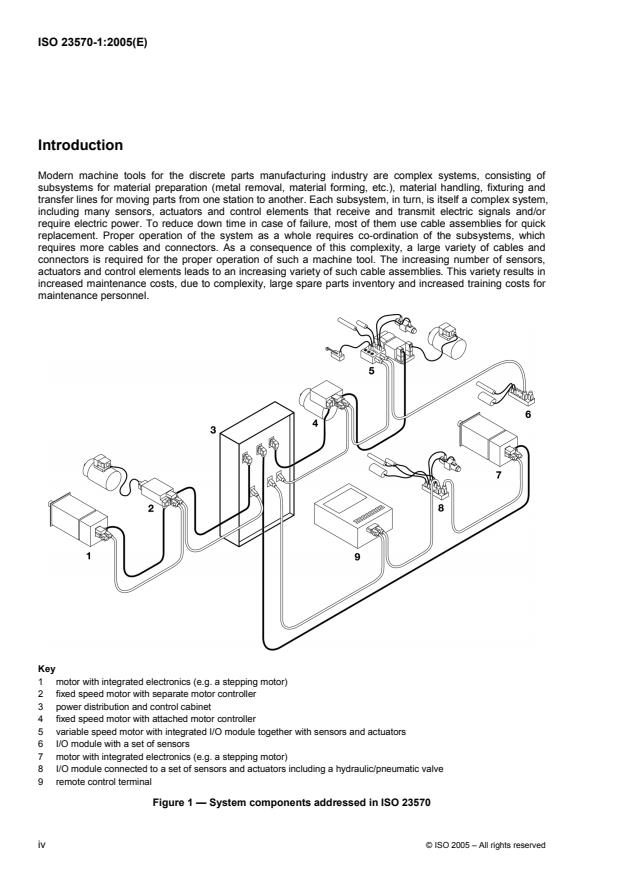 ISO 23570-1:2005 specifies the interconnection of elements in the control system of machine tools and similar large pieces of industrial automation. This specification includes cable types, sizes and sheath colours, connector types and contact assignments, and diagnostic functions appropriate to the sensors and actuators. ISO 23570-1:2005 specifies the interconnection of sensors and actuators with I/O modules that use their input or direct their output, and the diagnostic functions appropriate to those sensors and actuators.
