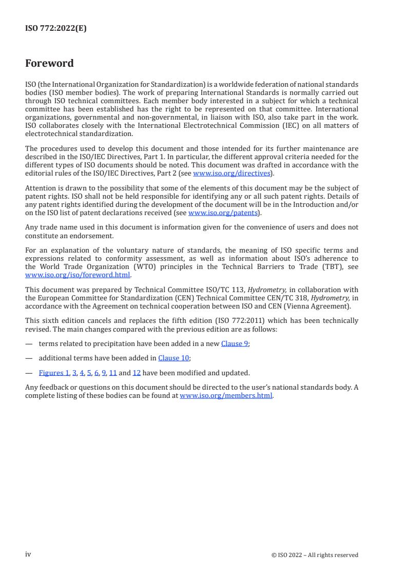 ISO 772:2022 - Hydrometry - Vocabulary and symbols is the sixth edition (2022) of the ISO international standard that defines the terms and symbols used across standards in the field of hydrometry. Its primary purpose is to provide a consistent, unambiguous set of vocabulary entries and symbols for measuring components of the hydrological cycle (rainfall, water level, flow, sediment transport, groundwater) and for related methods and equipment. The document was prepared by ISO/TC 113 (Hydrometry) in cooperation with CEN/TC 318.