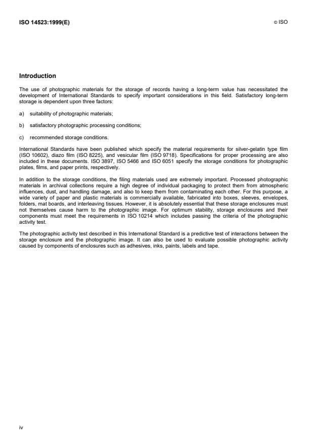 ISO 14523:1999 is a standard published by the International Organization for Standardization (ISO). Its full title is "Photography — Processed photographic materials — Photographic activity test for enclosure materials". This standard covers: Photography — Processed photographic materials — Photographic activity test for enclosure materials