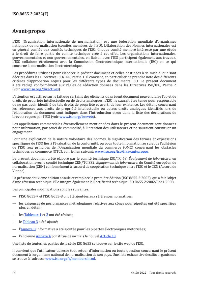 ISO 8655-2:2022 - "Piston-operated volumetric apparatus - Part 2: Pipettes" - is the international standard that defines metrological and usability requirements for single- and multi-channel pipettes. It covers air-displacement (Type A) and positive-displacement (Type D) pipettes, including fixed- and variable-volume models, together with their selected tips and essential consumables. The document specifies requirements for metrological performance, maximum permissible errors, marking, and user information to support correct operation, calibration and quality control.