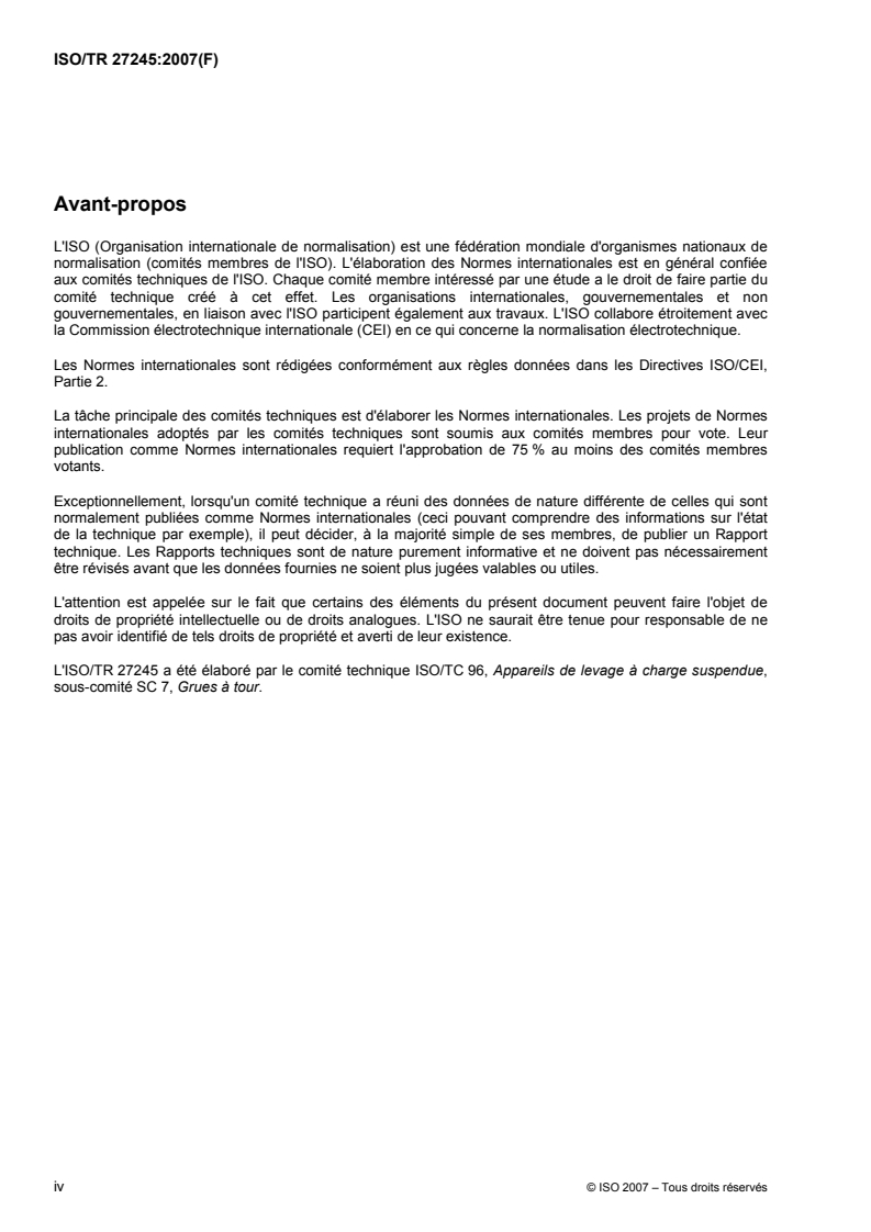 ISO/TR 27245:2007 is a Technical Report that compiles and organizes the International Standards applicable to tower cranes. Rather than creating new technical rules, it lists standards that can be wholly or partly applied to the design, manufacture, use and maintenance of tower cranes and provides a bibliography of other useful documents. Annex A identifies standards that are not applicable to tower cranes even when their scopes appear relevant. This report is informative in nature and helps users select the appropriate ISO/IEC standards for tower crane projects and safety programs.