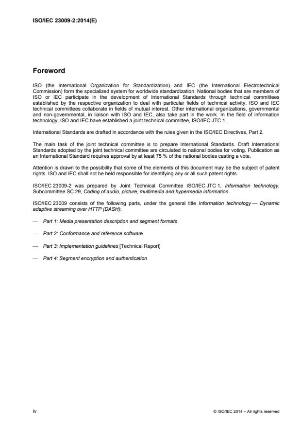 ISO/IEC 23009-2:2014 specifies the conformance and reference software implementing the normative clauses of all parts of ISO/IEC 23009. That is, test vectors comprising Media Presentation Descriptions, Segments, and combinations thereof that conform or do not conform to the normative clauses of the other parts of ISO/IEC 23009 and corresponding software modules.