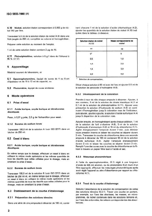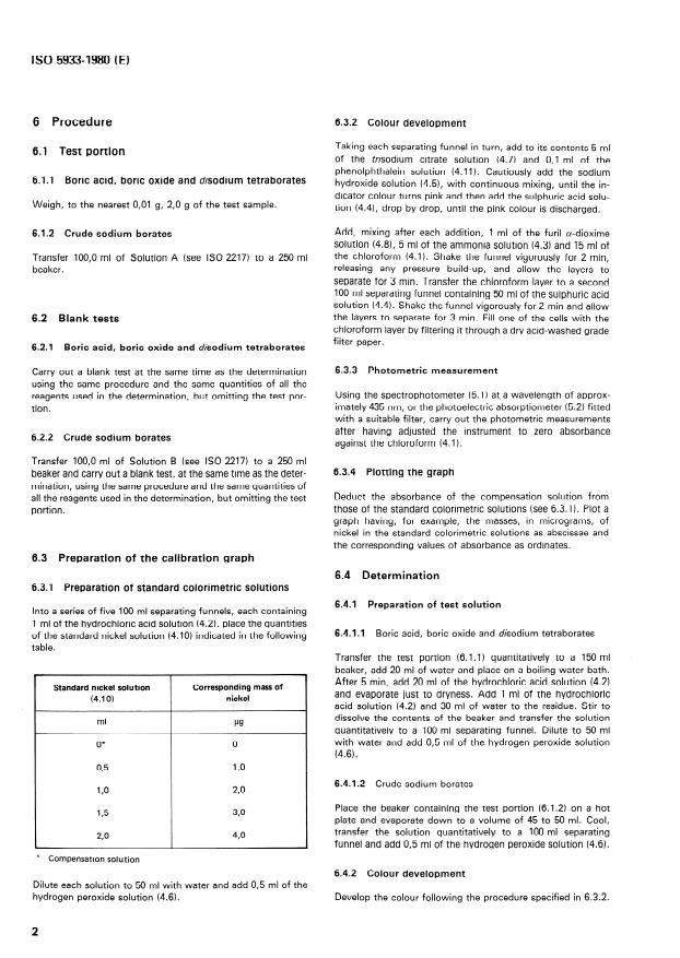 ISO 5933:1980 is a standard published by the International Organization for Standardization (ISO). Its full title is "Boric acid, boric oxide, disodium tetraborates and crude sodium borates for industrial use — Determination of total nickel content of boric acid, boric oxide and disodium tetraborates and the alkali-soluble nickel content of crude sodium borates — Furil alpha-dioxime photometric method". This standard covers: Specifies a method applicable to products in which the nickel content being determined exceeds 0,1 mg/kg. The principle of determination is based on dissolution of a test portion, formation of the coloured nickel furil -dioxime complex, extraction with chloroform and photometric measurement at a wavelength of about 435 nm.