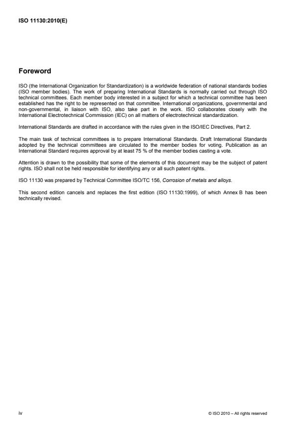 ISO 11130:2010 is a standard published by the International Organization for Standardization (ISO). Its full title is "Corrosion of metals and alloys — Alternate immersion test in salt solution". This standard covers: ISO 11130:2010 specifies a method for assessing the corrosion resistance of metals by an alternate immersion test in salt solution, with or without applied stress. The test is particularly suitable for quality control during the manufacture of metals including aluminium alloys and ferrous materials, and also for assessment purposes during alloy development. Depending upon the chemical composition of the test solution, the test can be used to simulate the corrosive effects of marine splash zones, de-icing fluids and acid salt environments. The term “metal” as used in ISO 11130:2010 includes metallic materials with or without corrosion protection. The alternate immersion test applies to metals and their alloys, certain metallic coatings (anodic and cathodic with respect to the substrate), certain conversion coatings, certain anodic oxide coating, and organic coatings on metals. ISO 11130:2010 is not applicable to stainless steel.